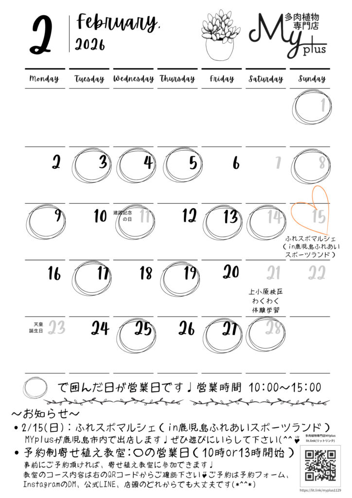 昨年中は大変ありがとうございました。はやいもので2026年も1ヵ月が過ぎ2月になりました。今年も多肉植物専門店MYplusは、みなさまに多肉植物の魅力を発信していけたらと思います!