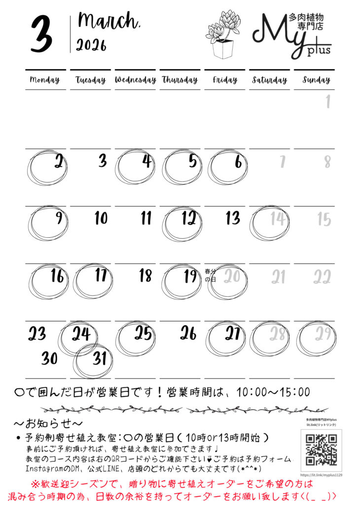 昨年中は大変ありがとうございました。はやいもので2026年も2ヵ月が過ぎ3月になりました。花芽も出だすようになり春を感じる季節になりました。今年も多肉植物専門店MYplusは、みなさまに多肉植物の魅力を発信していけたらと思います!